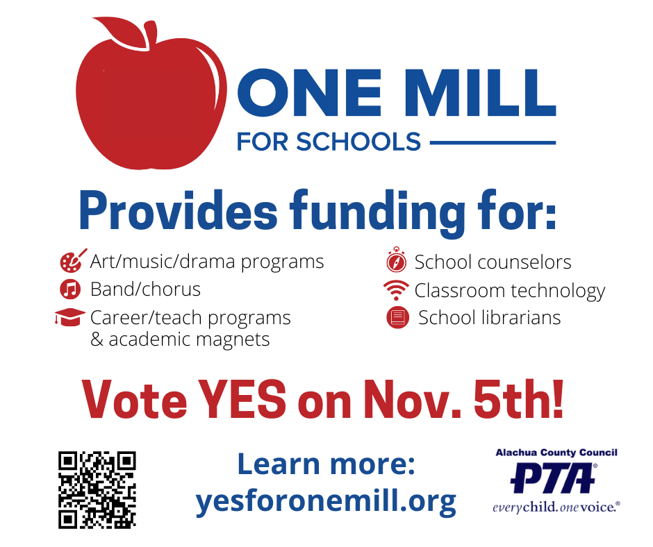One Mill provides critical funding for programs and personnel in all Alachua County schools in the following areas: school counselors, librarians, art/music/drama programs, career tech programs, academic magnets, band/chorus, and classroom technology. The funding comes from a property tax that has been in place since 2008 and is renewed every four years. One Mill will be on the ballot on November 5th, 2024. Without this funding, the school district is at risk of losing $23 million in annual revenue and 350 local teacher/school staff positions!